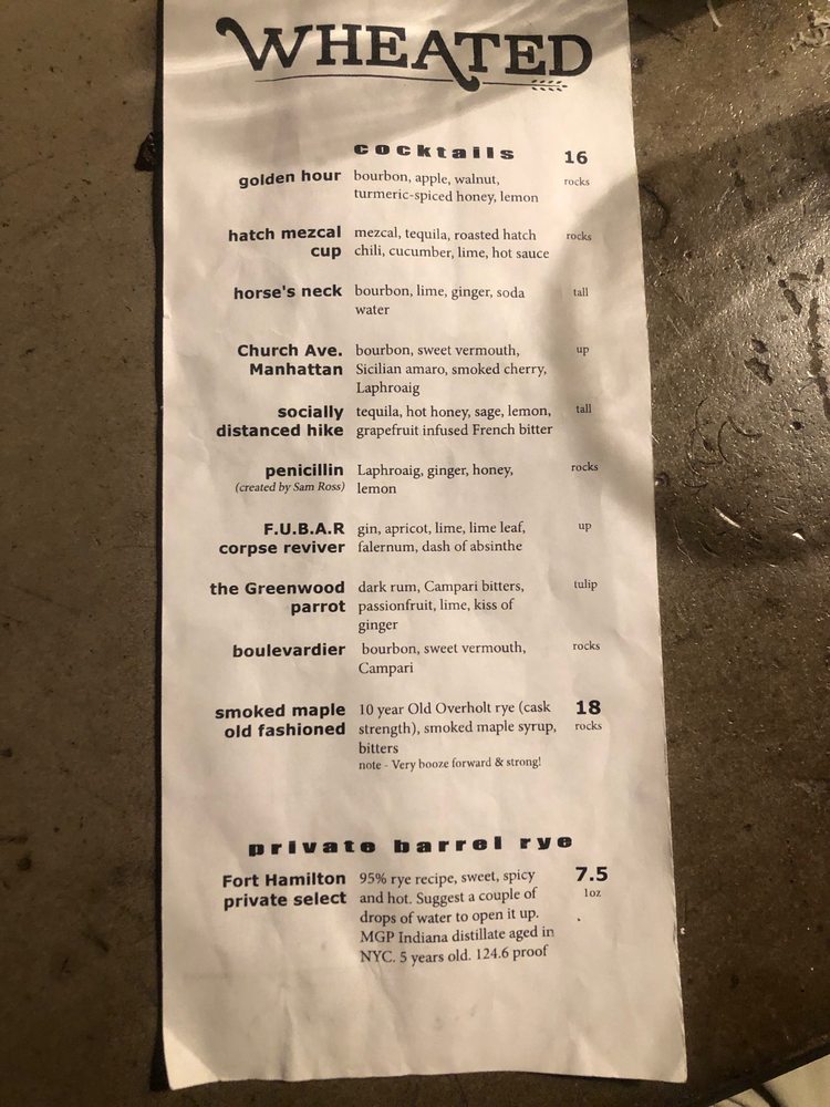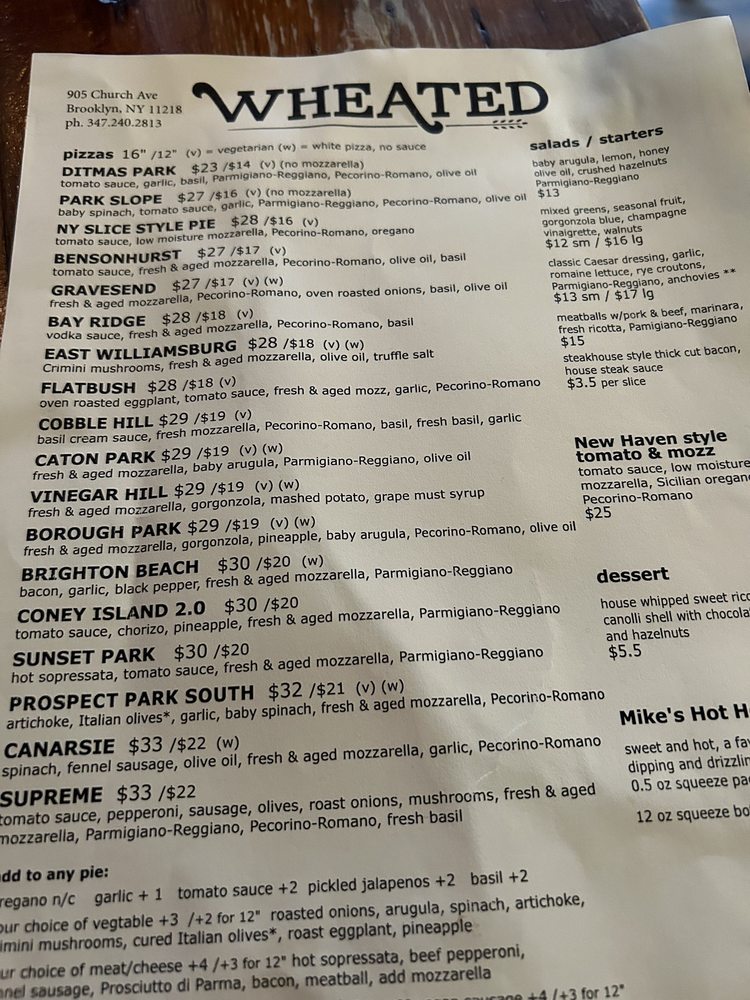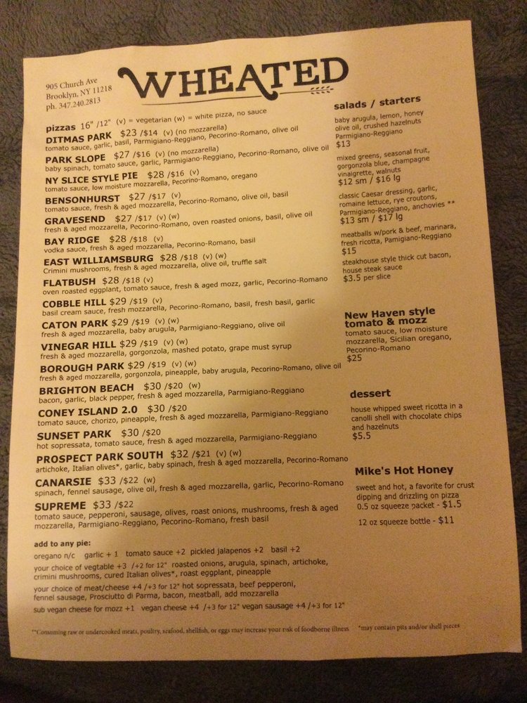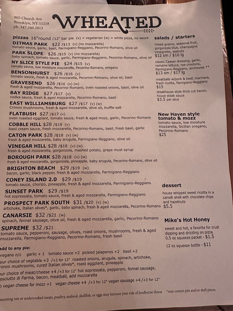 Introducing the menu at Wheated in Brooklyn, NY, a whiskey bar and pizza joint with a wide array of offerings. Despite not being wheelchair accessible, the restaurant caters to various dietary preferences with vegan and vegetarian options. With a full bar, outdoor seating, and even a pool table, Wheated is a casual spot perfect for dinner or drinks. Customers rave about the delicious pizzas, including unique toppings like vodka sauce and bacon. The whiskey selection is unparalleled, and the friendly staff are knowledgeable and attentive. While the space can get crowded, making reservations or opting for takeout is recommended. Overall, Wheated offers a cozy charm and outstanding food that embodies the genuine Brooklyn neighborhood spirit.